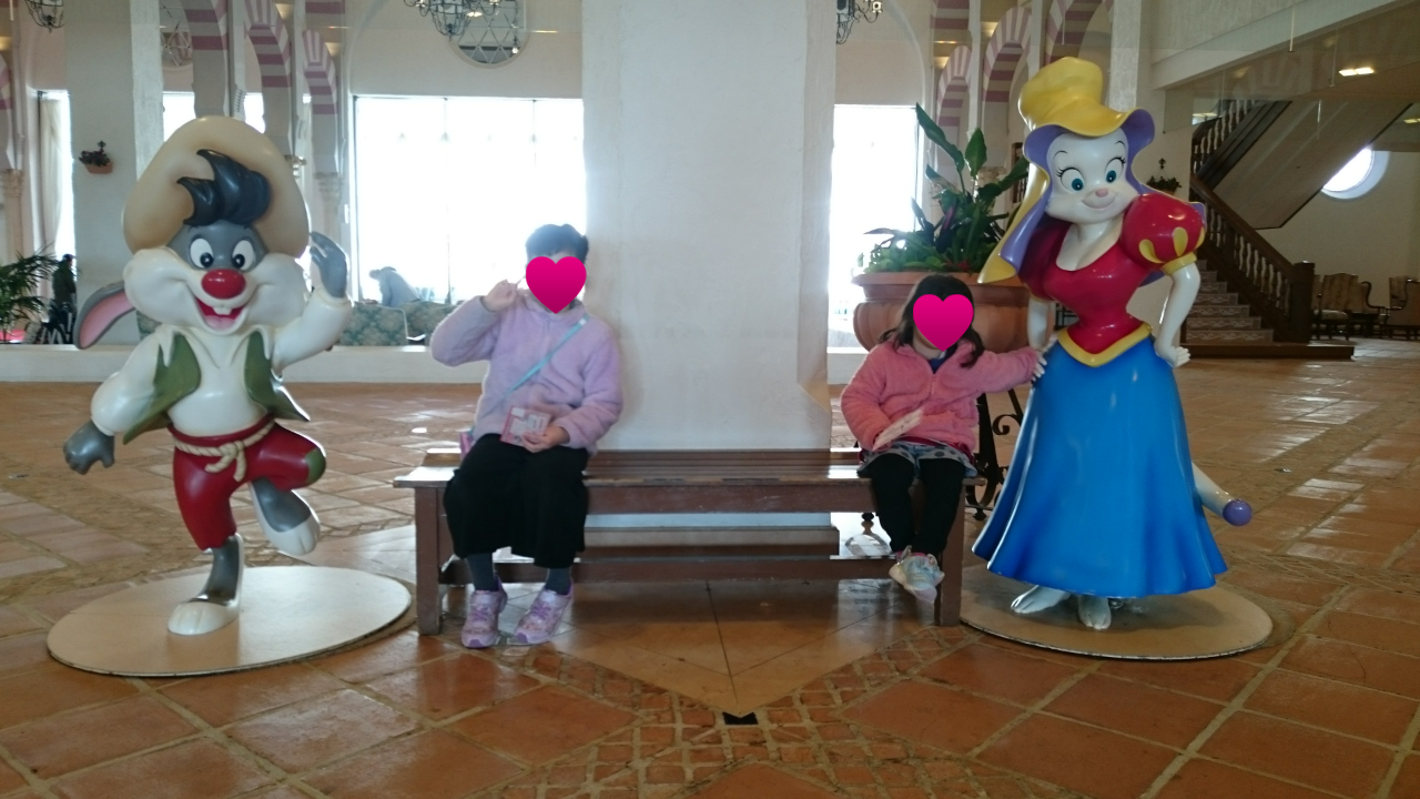 2日目は開門と同時にパルケ。お出迎えしてくれたキャラクターと記念撮影。今回は3体と撮れました。姉妹の推しキャラは猫のダルちゃんです♪